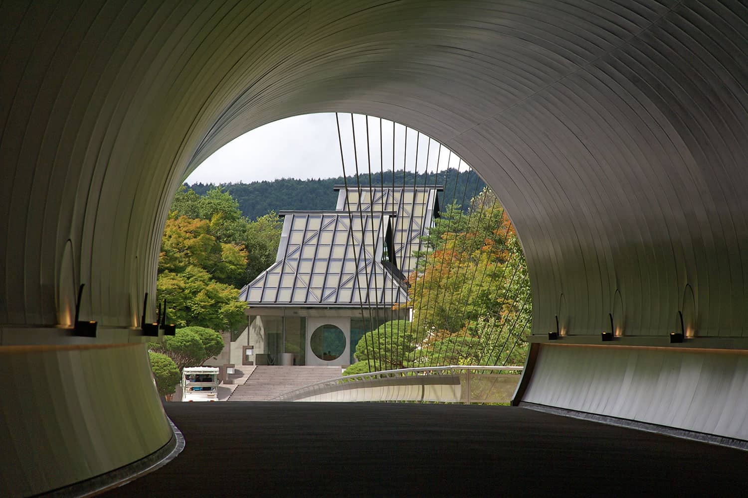Perhaps the most interesting aspect of the museum is the design of its structures and how they are integrated into their natural surroundings. The path to the museum angles toward its entrance through a tunnel and over a bridge that spans two mountain ridges.